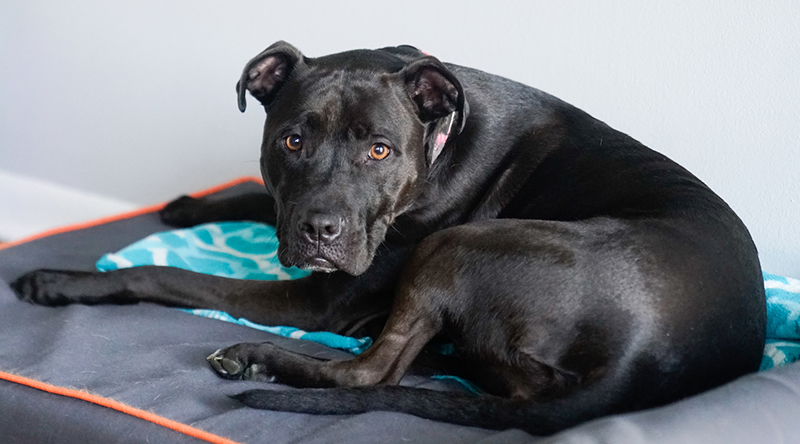 River, one of Rebecca Welly's dogs, rests on a dog bed on Monday, April 10, 2023, at Welly's home in Columbia. Welly adopted River in the winter of 2019. (Photo by Lucas Owens)