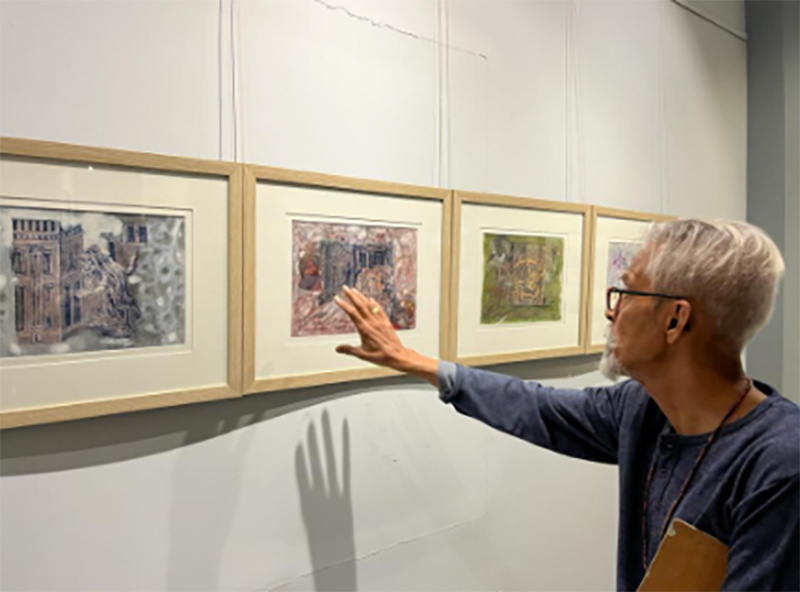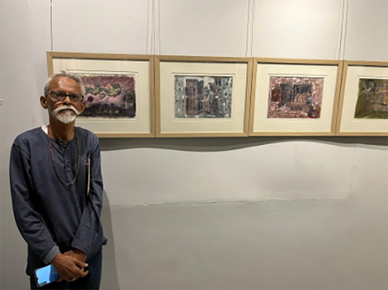 As one walks through the show, several works draw attention. One among those were the works of Prabal C Baral whose mixed media on print is inspired by the illustrations of Thakumar Jhuli, a collection of Bengali folk and fairy tales by Dakshinaranjan Mitra Majumder which were published in 1907.