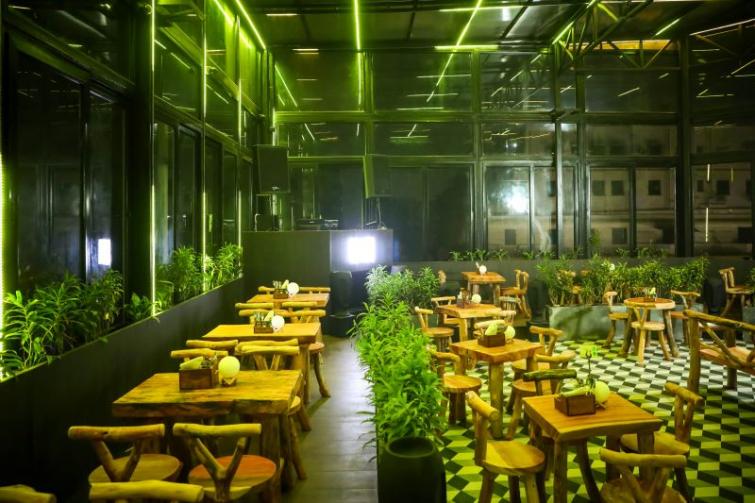 Usage of rustic wooden furniture, the modern rooftop glass bar makes one feel the lavish vibes.