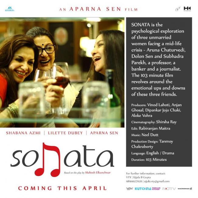 Sonata deals with different shades of female friendship between and among three elderly women who belong to different professions, different states in India and live by different ideologies. They live and work in Mumbai and stay together in the same flat though one of them keeps flitting in and out depending on the fluctuations of her relationship with her abusive male partner.