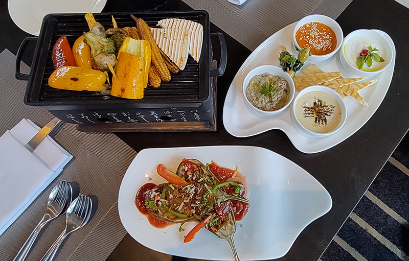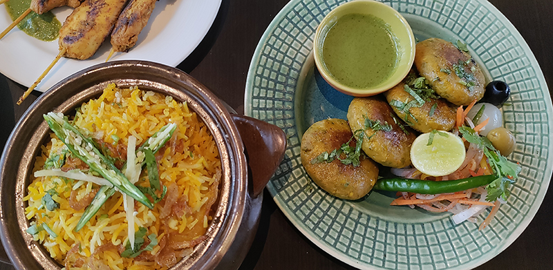 We start with some chicken satay, assorted grilled vegetables, and bhutte matar ki shammi (veg kebabs), accompanied by some great tea and coffee. I started the meal with coffee rather than end with it — just a personal preference — and the blended coffee was outstanding. Served with some chilled lemon water and chilled basil water to cleanse the palate, the coffee brought pure happiness.