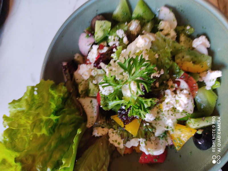 The Rustic Greek Salad is so refreshing! Mixed salad leaves, red onions, olives, cherry tomatoes and cucumber are tossed in a lemon vinaigrette dressing topped with feta cheese.