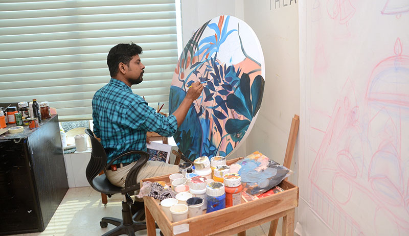A wide range of artworks have been curated such as paintings, wall murals, sculptures etc. done in watercolors, oils on canvas, mixed media, acrylics, pastels, gouache and so on; the subject matters include among others landscape, seascape, figurative and abstract art.