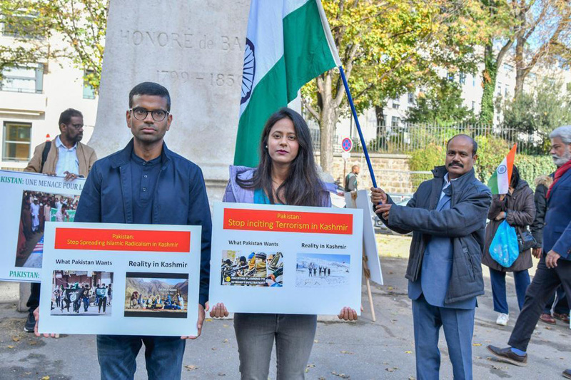 Paris: Members of the Indian diaspora in France and Friends of India came together to demonstrate outside the Pakistan Embassy in Paris to demand for peace in Kashmir on Saturday as they marked the 75th year for the invasion of Kashmir by Pakistan in 1947.