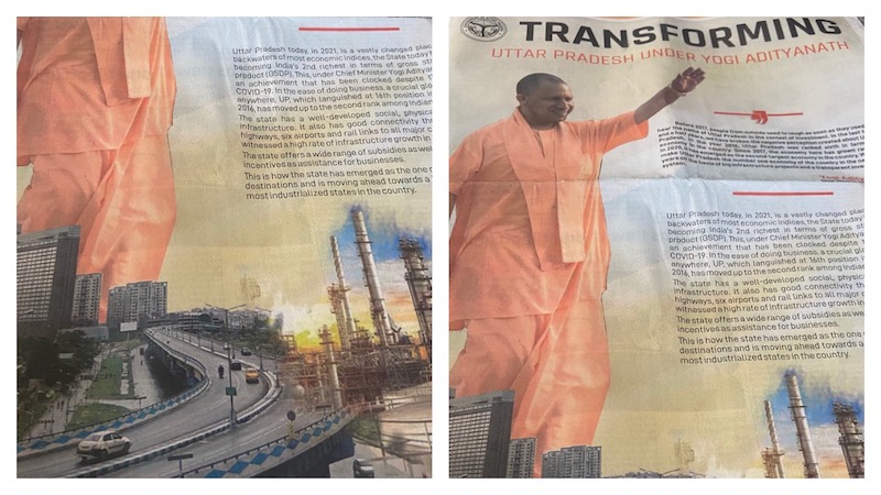 A full page Yogi Adityanath ad showcasing development features Kolkata's Maa flyover