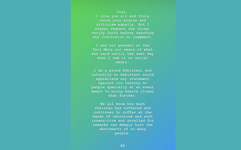 Ali took to his Instagram story to say, "Guys, I love you all and truly value your praise and criticism equally. But I always request one thing – verify facts before reaching any conclusion or judgement. I was not present at the Faiz Mela nor aware of what was said until the next day when I saw it on social media."