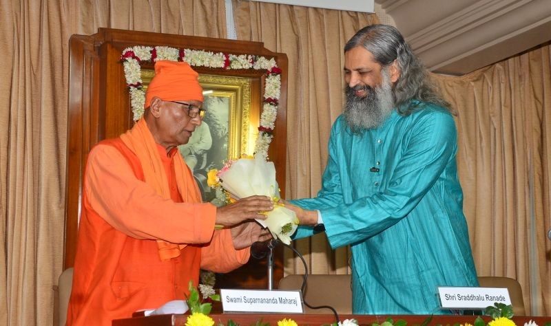 Swami Suparnananda Maharaj, Secretary of RMIC, feliciates Sri Sraddhalu Ranade. Photo: PR Team