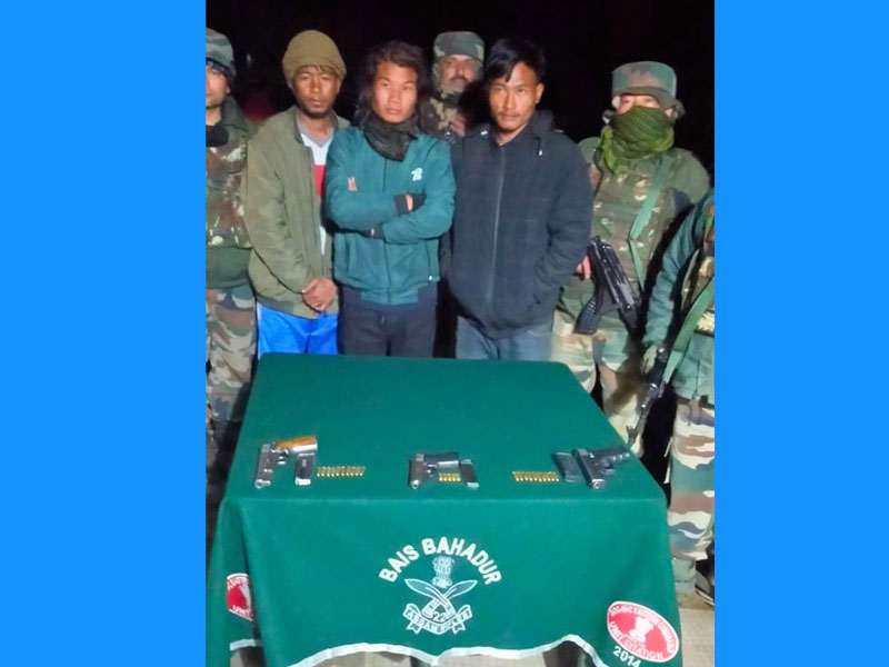 According to the reports, Jwalamukhi Battalion of Headquarter 22 Sector Assam Rifles under the aegis of Headquarters Inspector General Assam Rifles (East), apprehended 3 active cadres of KRA with three 9mm pistols, 25 live rounds and two mobile phones in Kangchup in Kangpokpi district of Manipur on Feb 25.