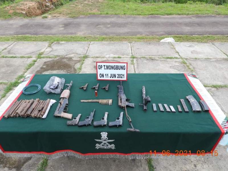 The troops had recovered one AK-47 rifle , two CMGs, two 0.32 mm pistols, two 0.22 mm pistols, eight assorted magazines, thirty-six rounds, and explosives from Tmongbung Village in Imphal district in Manipur.