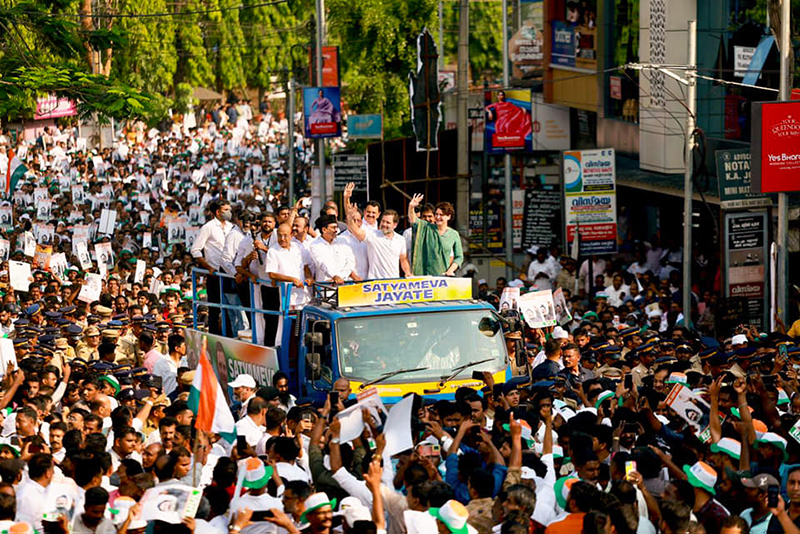 Rahul's roadshow was joined by hundreds of United Democratic Front (Congress-led state opposition alliance) workers who lined up holding the Indian flag.