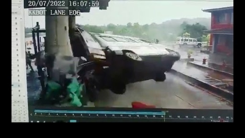 The footage shows one of the guards successfully removing two barricades before the toll plaza.
