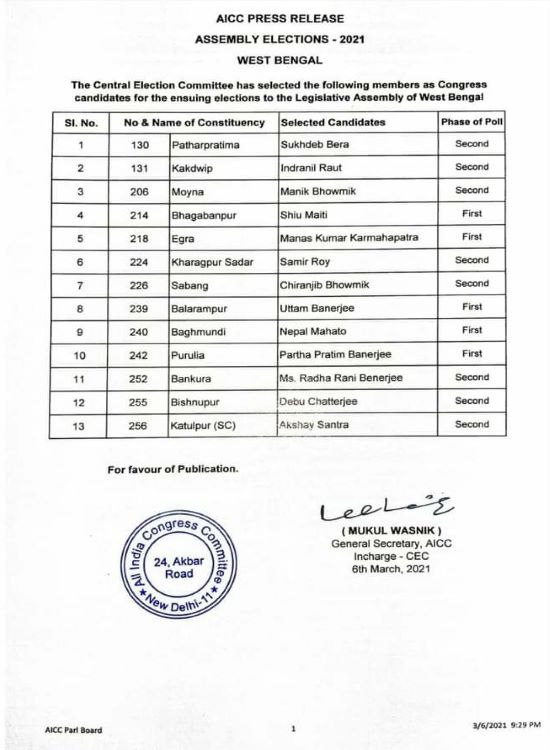Kolkata/IBNS: The Congress announced its list of 13 candidates for the first two of the eight phases of assembly elections.