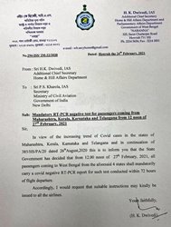 "In view of the increasing trend of Covid cases in the states of Maharashtra, Kerala, Karnataka, and Telangana, and in continuation of 385/HS/PA/20 dated August 26, 2020, this is to inform you that the state government has decided that from 12 noon of February 27, 2021, all passengers coming to West Bengal from the aforesaid four states shall mandatorily carry a covid negative RT-PCR report for such test conducted within 72 hours of the flight departure," the letter dated February 24, 2021 (Wednesday) read.