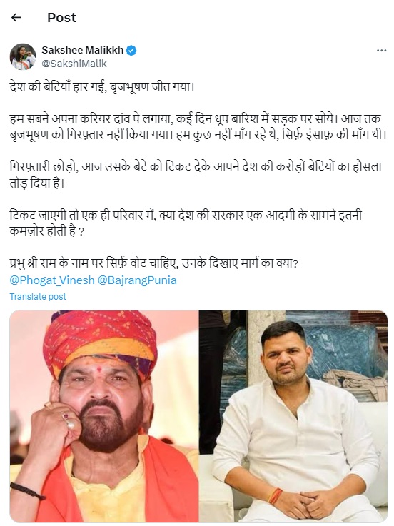 "Daughters of the country lost, Brij Bhushan won. We all put our careers at stake and slept on the streets for many days in the sun and rain. To date, Brij Bhushan has not been arrested. We were not demanding anything, we were only demanding justice," Sakshee Malikkh wrote on X.
