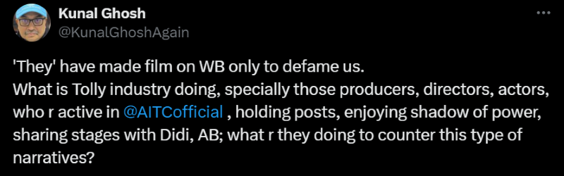 In an X post, TMC leader Kunal Ghosh said, "'They' have made film on WB only to defame us. What is Tolly industry doing, specially those producers, directors, actors, who r active in @AITCofficial, holding posts, enjoying shadow of power, sharing stages with Didi, AB; what r they doing to counter this type of narratives?"