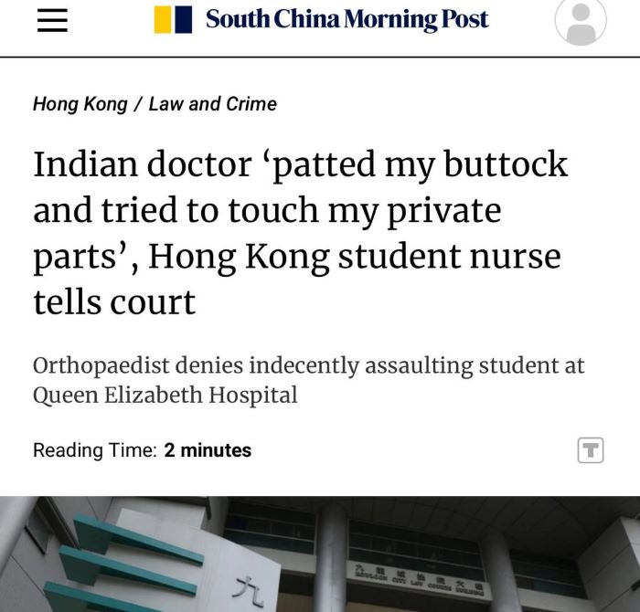 As per the report, a Hong Kong nursing student had alleged that an Indian orthopaedist, (read Sandip Ghosh), tried to touch his private parts and even stroked his left buttock, while he was changing his clothes at Queen Elizabeth Hospital.