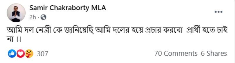 Samir Chakraborty, the state's richest MLA with a declared asset-value of more than Rs. 40 crore, wrote on his official Facebook page: "I have informed my party's supremo that I will continue poll-campaigns with the party and I don't want to be a candidate in this election."