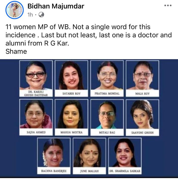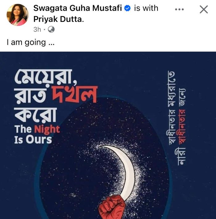 Swastika wrote on Facebook, "Take to the streets to protest against sexual harassment in the workplace and educational institutions. Everyone is welcome/ Join in groups. We demand swift justice for the rape and murder at R.G. Kar Medical College."