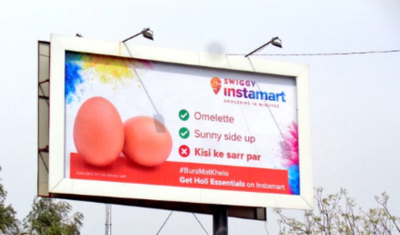 In a billboard, Swiggy urges its customers to buy Holi essentials on Swiggy Instamart with a picture of a couple of eggs.