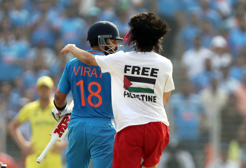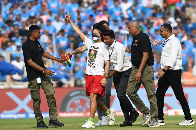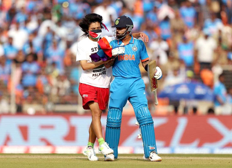 Narendra Modi stadium witnessed a major security breach on Sunday afternoon during the World Cup final match between India and Australia when a pitch intruder, wearing a 'Free Palestine' t-shirt entered the cricket ground and even hugged Virat Kohli.