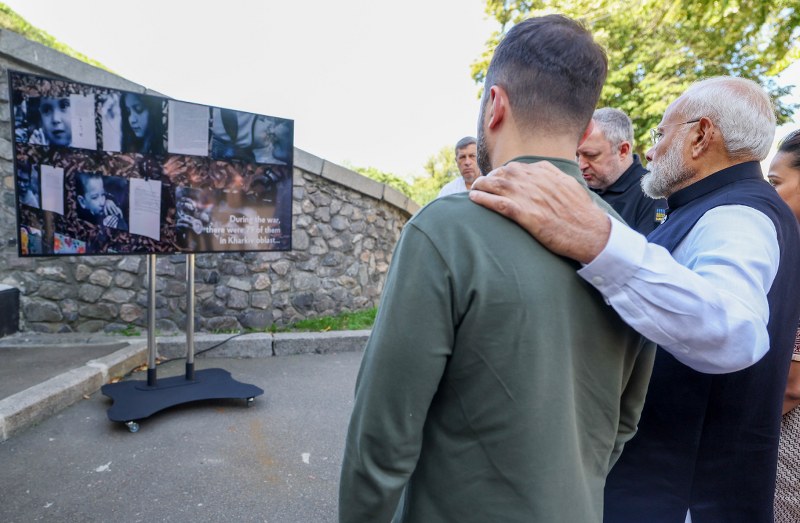 PM Modi with Ukraine President Zelenskyy honours the memory of children at Martyrologist Exposition in Kiev on Aug 23, 2024. Photo credit: PIB