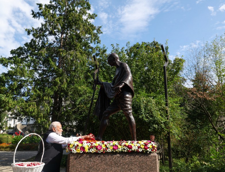 The Indian PM also paid tribute to a memorial statue of Mahatma Gandhi in Kyiv.