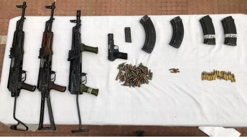 During search, they said that two Ak-47 rifles, two AK-47 magazines, one .223 bore Pak made AK shape gun with handgrip, two magazines of .233 AK shape gun, one Chinese Pistol with magazine, 63 rounds of Ak-47, 20 rounds of .223 Pak Ak shape gun and four Chinese pistol rounds, were recovered.