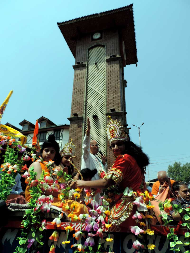 The Yatra with a group of children dressed in traditional attire was taken out from Kathleshwar temple in Tankipora area in Srinagar and passed through the roads of Habbakadal, Ganpathyar, Barbar Shah, Regal Chowk, Lal Chowk, Hari Singh High Street and Jahangir Chowk amid tight security arrangements.