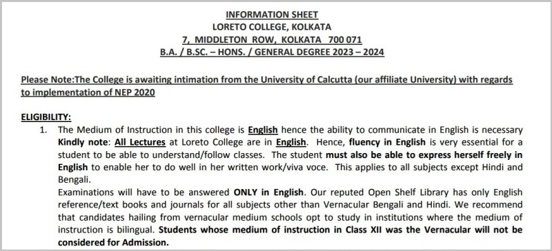"Students whose medium of instruction in class XII was the vernacular will not be considered for admission," Loreto College wrote in bold letters in its admission notice.