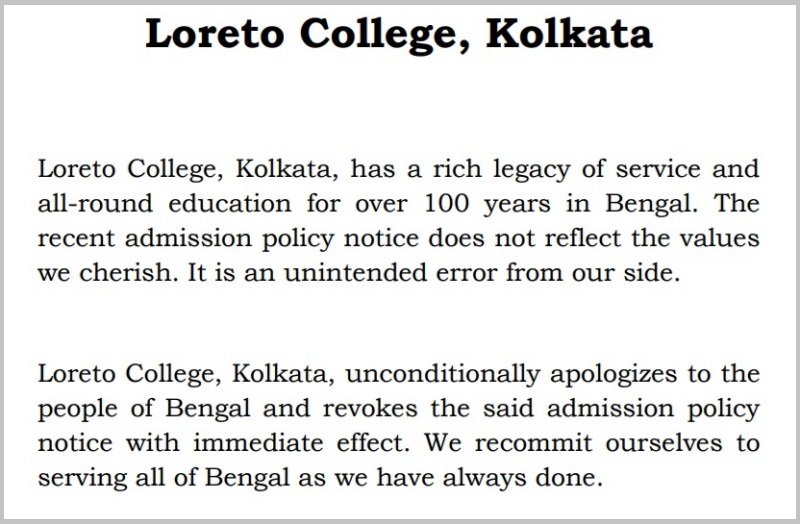 "Loreto College, Kolkata, unconditionally apologizes to the people of Bengal and revokes the said admission policy notice with immediate effect. We recommit ourselves to serving all of Bengal as we have always done," it added.