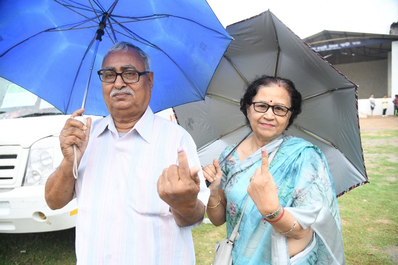Voters showing indelible ink mark after casting their votes at a polling booth during the 3rd Phase of General Elections-2024 at Guwahati, in Assam. (Image credit: PIB)