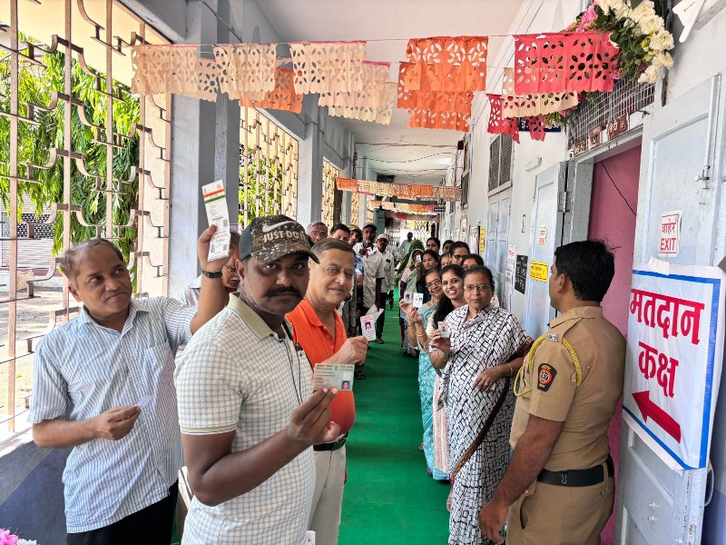 Voters displaying identity cards as they queue up to cast votes at polling booth during the 3rd Phase of General Elections-2024 at Maharashtra's Sangli. (Image courtesy: PIB)