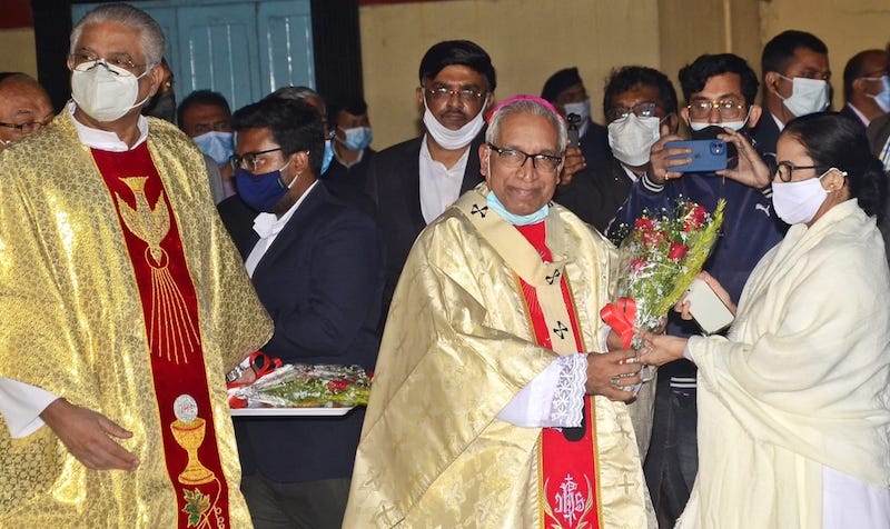 Father Franklin Menezes, Pro Vicar, His Grace Thomas D'Souza, Archbishop of Catholic Diocese of Calcutta, welcoming Mamata Banerjee at The Cathedral of the Most Holy Rosary in Kolkata on Christmas Eve.