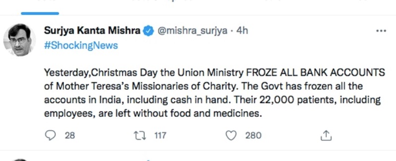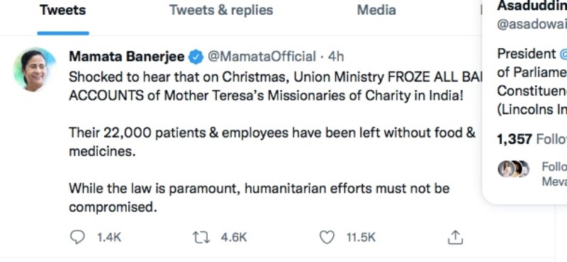 "Shocked to hear that on Christmas, Union Ministry FROZE ALL BANK ACCOUNTS of Mother Teresa’s Missionaries of Charity in India!" Mamata Banerjee wrote on Twitter.