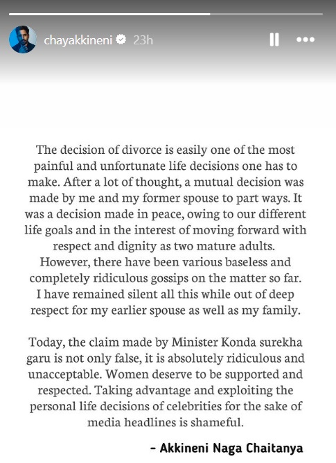 Naga Chaitanya called his divorce a "painful and unfortunate life decision" and said, "... a mutual decision was made by me and my former spouse to part ways. It was a decision made in peace... owing to our different life goals and in the interest of moving forward with respect and dignity..."