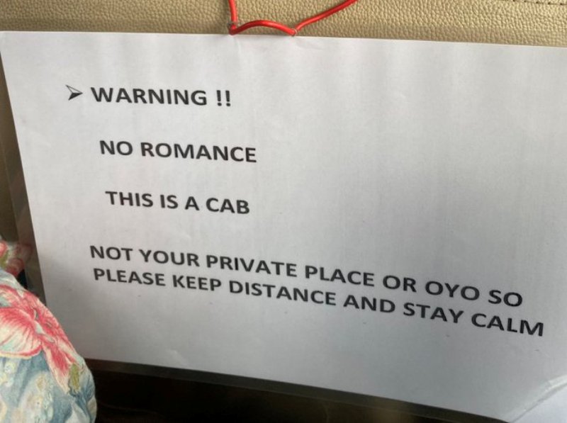 The full message reads: "Warning!! No romance. This is a cab, not your private place... so please keep distance and stay calm."