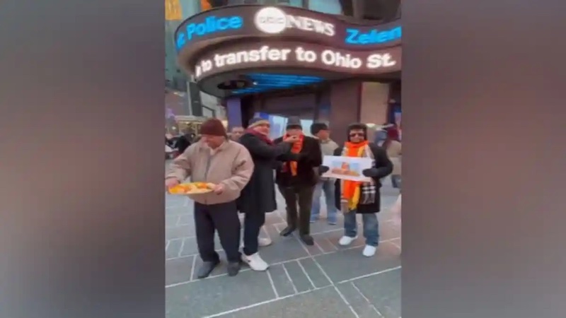 Members of the 'Overseas Friends of Ram Mandir' distributed laddoos (sweets) at Times Square in the US city of New York on Sunday ahead of the consecration ceremony of the newly built Ram Temple in Ayodhya.