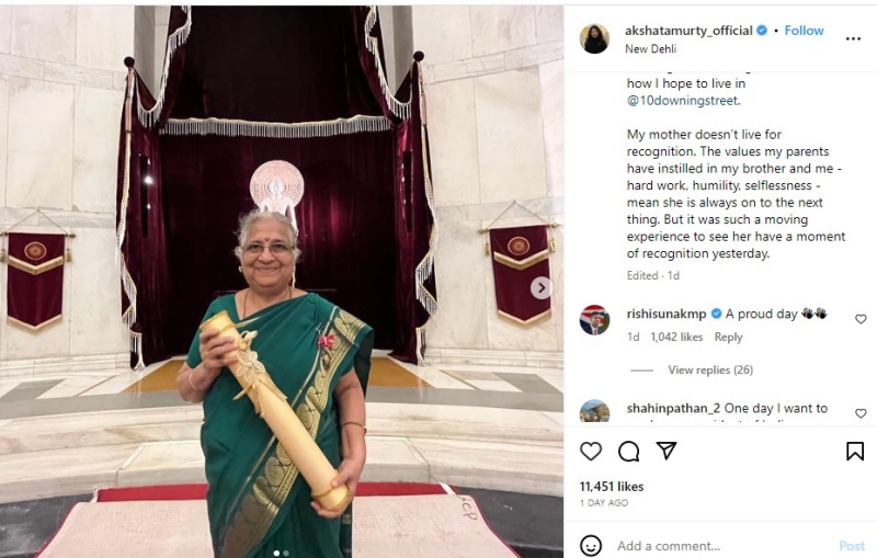 "My mother doesn’t live for recognition. The values my parents have instilled in my brother and me - hard work, humility, selflessness - mean she is always on to the next thing. But it was such a moving experience to see her have a moment of recognition yesterday," Akshata ended her long post.