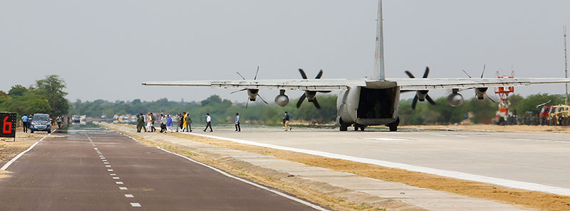 Singh and Gadkari, along with Indian Air Force Chief Air Chief Marshal RKS Bhadauria landed on the strip in a C130J aircraft of the Indian Air Force. The strip is on the Satta-Gandhav stretch on NH-925A on the Barmer-Jalore road.