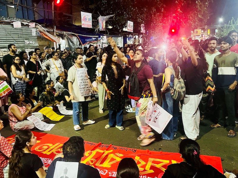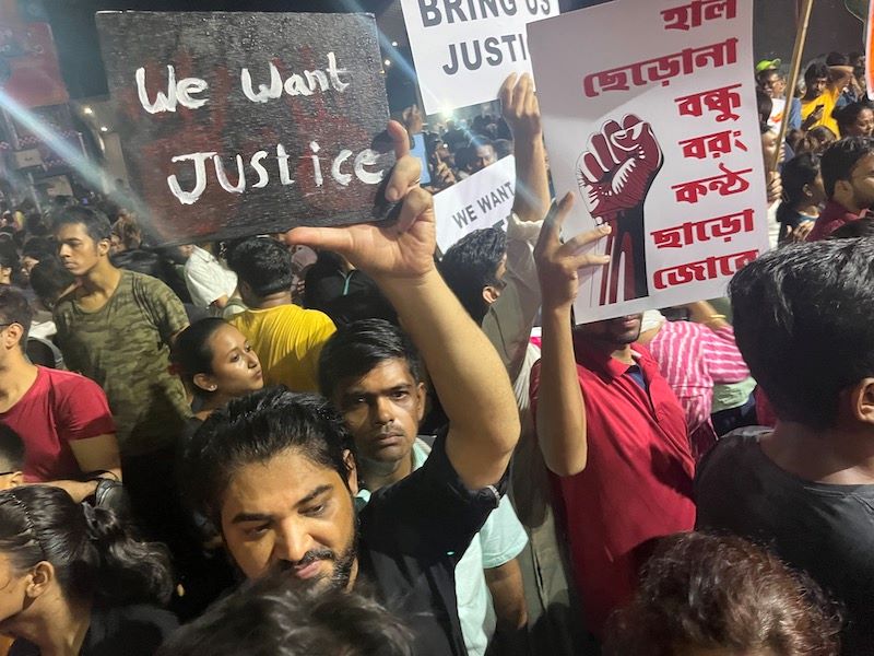 Like every location, hundreds of protesters gathered in front of Kolkata's Academy of Fine Arts and held candlelight vigil to protest the brutal rape and murder.