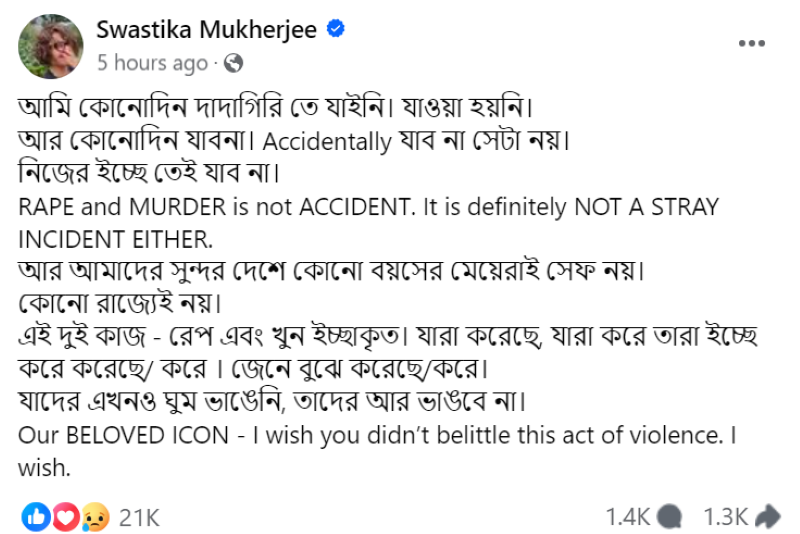 Actress Swastika Mukherjee too lashed out at Ganguly saying, "RAPE and MURDER is not ACCIDENT. It is definitely NOT A STRAY INCIDENT EITHER... Our BELOVED ICON - I wish you didn’t belittle this act of violence. I wish."