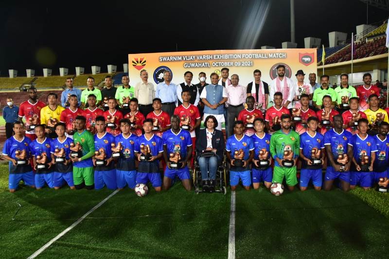 Guwahati/IBNS: As part of Swarnim Vijay Varsh celebrations, Swarnim Maitri football match was played between Brahmaputra Braves and North East Tigers, combined teams of Indian Army, Assam Rifles and players from famous football clubs like Shillong Lajong FC, Aizawl FC and Gokulam Kerala FC at Indira Gandhi Athletics Stadium in Guwahati on Saturday evening.