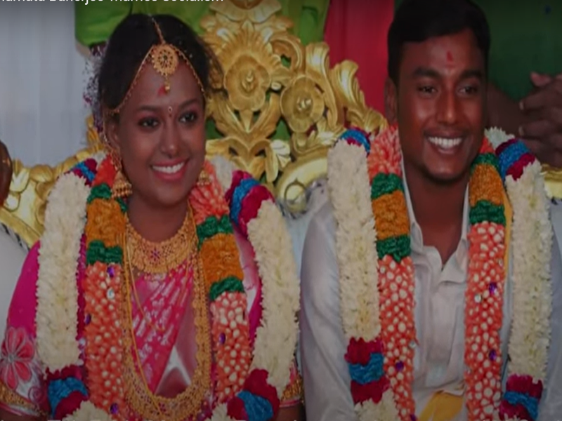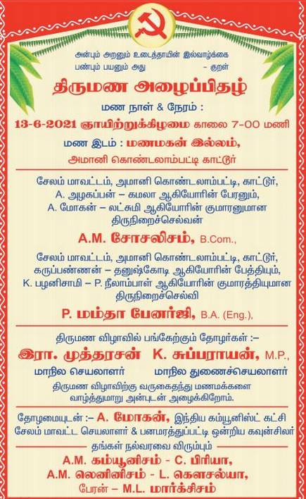 Socialism, the 29-year-old groom, owns a business of silver anklets and holds a B. Com Degree. His father A Mohan is the district secretary of CPI unit in Salem.