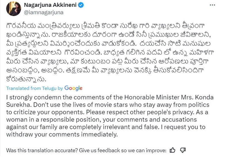 "I strongly condemn the comments of the Honorable Minister Mrs. Konda Surekha. Don't use the lives of movie stars who stay away from politics to criticize your opponents. Please respect other people's privacy," read a rough translation of his post on X, formerly Twitter.