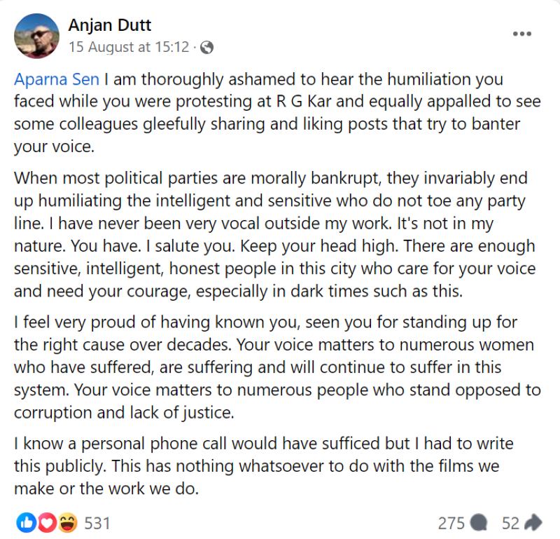 In his post, Anjan Dutt wrote, "I am thoroughly ashamed to hear the humiliation you faced while you were protesting at R G Kar and equally appalled to see some colleagues gleefully sharing and liking posts that try to banter your voice..."