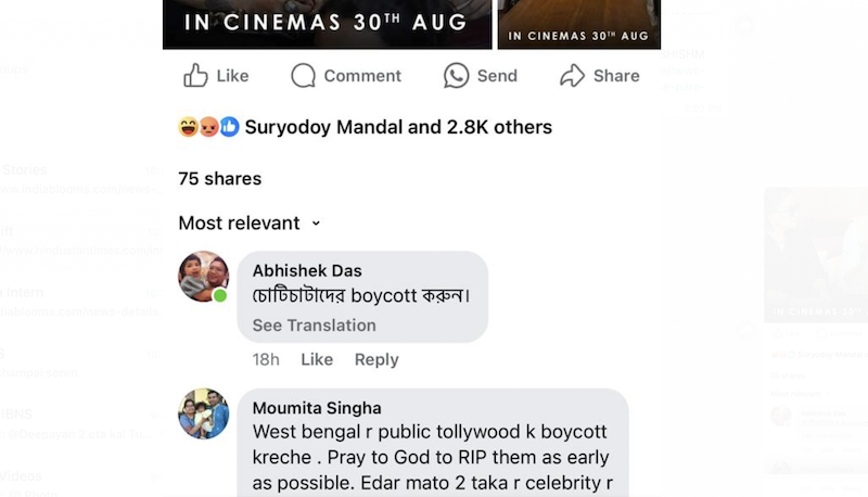 Saptadwipa Ghoshal writes in comments box, "boycotttollywood".