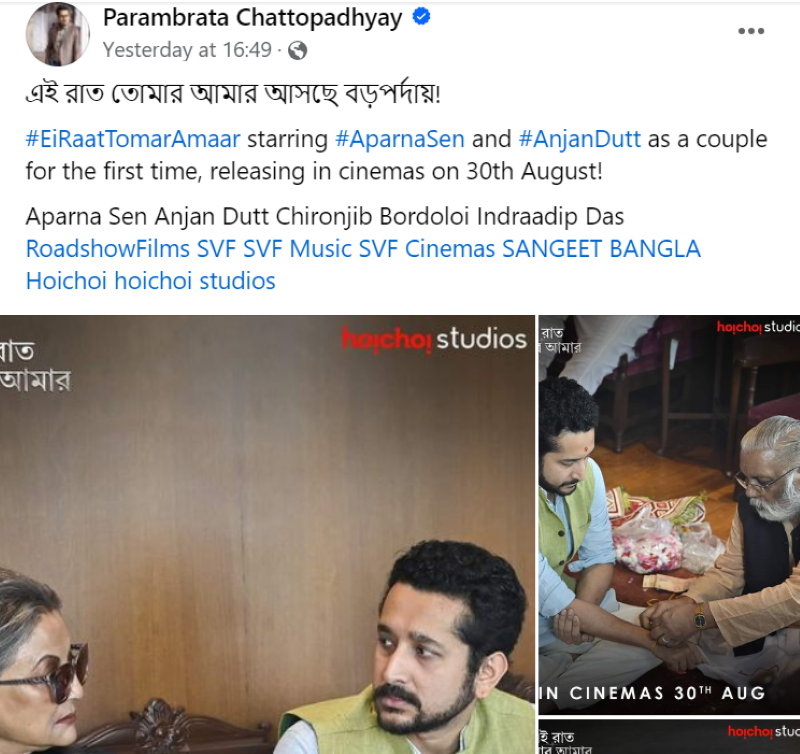Parambrata wrote, "#EiRaatTomarAmaar starring #AparnaSen and #AnjanDutt as a couple for the first time, releasing in cinemas on 30th August!"