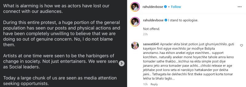 Rahul wrote on Facebook, "I stand to Apologise. Not offend. What is alarming is how we as actors have lost our connect with our audiences. During this entire protest, a huge portion of the general population has seen our posts and physical actions and have been completely unwilling to believe that we are doing so out of genuine concern. No, I do not blame them.