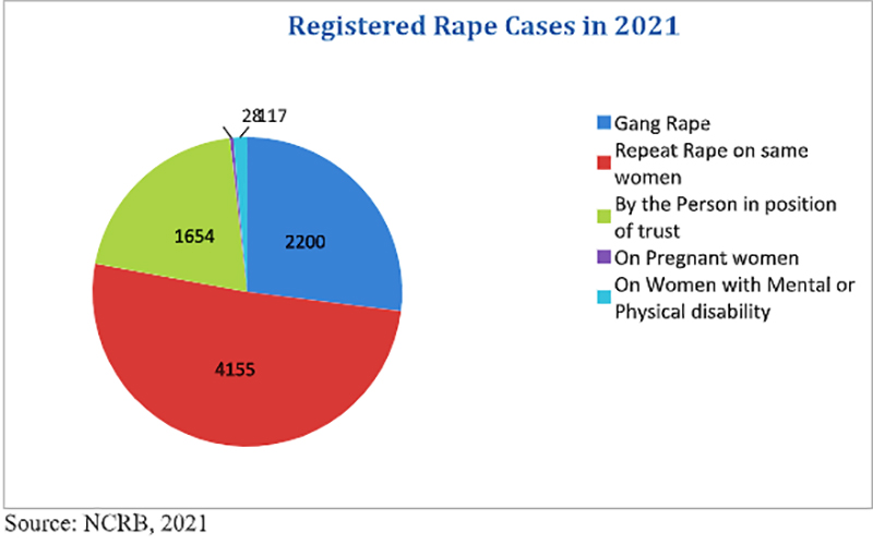 The graph depicts rape statistics from 2021, when 31677 rape cases were reported, with 4155 repeat rapes on the same woman. A terrible image raises a question: how would the accused have the guts to rape the same woman again if the existing law had intervened quickly?
