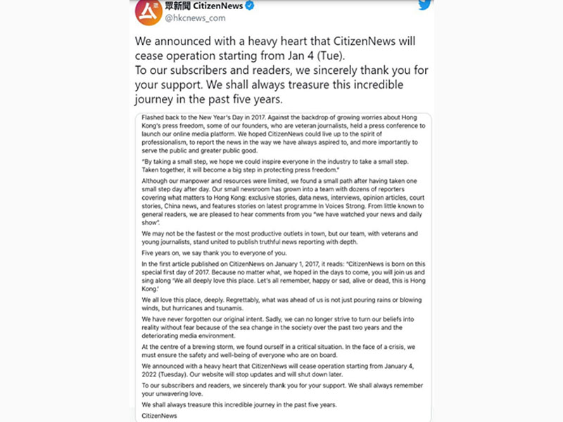Following the raid, Stand News has ceased all its operations. Stand News was founded in December, 2014 and was a not-for-profit online news portal.